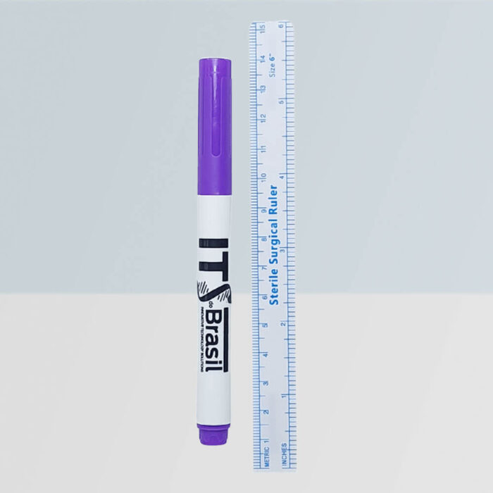 • Conjunto de caneta marcadora cirúrgica e régua para auxiliar o cirurgião nos procedimentos que necessitam de planejamento para o ato cirúrgico.